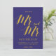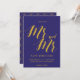 Um "Save the Date" rústico chique, apresenta o "Sr e Sr" com letras em script na cor dourada sobre fundo azul cobalto.