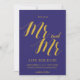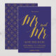 Um "Save the Date" rústico e sofisticado, apresenta "Sr e Sr" com letras em script douradas sobre um fundo azul cobalto.