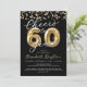Comemora 60 anos com esses convites de festas elegantes e festivos de preto e ouro com o título CHEERS A 50 anos em números falsos de balões metálicos de ouro e tipografia moderna de escrita com galerias de ouro e luzes de confete e brancas. ASSISTÊNCIA: Para obter ajuda com a modificação ou personalização do design, alteração de cor, transferência do design para outro produto ou se você quiser coordenar itens, entre em contato com o designer ANTES de fazer o pedido via Chat Zazzle ou email makeitaboutyoustore@gmail.com.