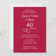 Personalize este elegante convite de festa de 40º aniversário de casamento adicionando os nomes do casal e os detalhes da festa. Meus corações entrelaçados originalmente desenhados acentuam o moderno e estiloso "40 Anos". Personalize este cartão vermelho rubi com tipografia moderna para seus propósitos. Você também pode alterar o número para um aniversário de 25 anos, ou 10º aniversário de casamento, 50º ou 60º ou qualquer aniversário. Seria um convite de festa de aniversário de casamento romântico e encantador. Veja minha coleção para decoração de mesa e artigos de vidro para casamento de 40º aniversário de casamento vermelho rubi.