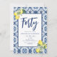 Este elegante convite de aniversário para adultos tem um tema de limão mediterrânico. A borda é um azulejo mediterrânico clássico, azul-aquarela e branco, com limão de aquarela e buquês florais. O texto é caprichoso e clássico ao mesmo tempo.
