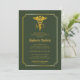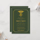 Um "MD" caduceus dourado e um tom de ouro de quadro redimensionado e um design de convite de festa de formatura verde que pode ser personalizado para a graduação em medicina. Design composto por Holiday Hearts Design (direitos reservados).