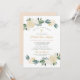 Esta cerimônia de na moda e convite para comemoração de almoço para uma menina apresenta uma elegante redação personalizada para o seu evento especial, acentuada por uma cruz de ouro e emoldurada por um belo design de corda d'água floral com rosas pintados, flores ranunculus e verde em tons neutros de branco, creme, ouro, ouro rosa e verde. Um fundo pastel de pêssego com espaço de fotos recém-nascido aparece na parte traseira da placa. Personalize o texto do "Deus abençoe" com o nome do bebê no script.