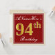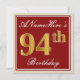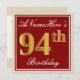 Estas características simples e da bolsa mensageifesta de aniversario elegante do convite de design uma mensagem personalizada como de "aniversário ANameHere o 94th" (com "94th" tendo o falso/imitação ouro-como o olhar da coloração) dentro de uma área quadrada vermelho-colorida que caracteriza um esboço de beira simples. O nome em um elegante branco-é colorido roteiro-como o texto, e pode ser personalizado. As características traseiras personalizaram detalhes do convite. Um convite de aniversário como este poderia talvez ser usado ao convidar pessoas a uma festa de aniversário que está sendo guardarada para alguém que está comemorando seu ninety quartos aniversários. [~Z0000227]