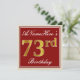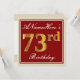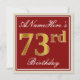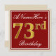 Este design simples e elegante de convite de festa de aniversário apresenta uma mensagem personalizada como "Aniversário de 73 anos de ANameHere" (com o "73º" tendo uma aparência de coloração dourada falsa/imitação) dentro de uma área quadrada de cor vermelha com um contorno simples de borda. O nome está em um texto elegante com aparência de escrita à mão de cor branca e pode ser personalizado. O verso apresenta detalhes personalizados do convite. Um convite de festa de aniversário como este poderia ser usado ao convidar pessoas para uma festa de aniversário realizada para alguém que está celebrando seu septuagésimo terceiro aniversário. [~Z0000227]