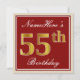 Este simples e bolsa mensageifesta de aniversario elegante de convite apresenta uma mensagem personalizada como "55.º Aniversário do NameHere" (com o "55.º" a ter uma aparência falsa/imitada de cor dourada) dentro de uma área quadrada de cor vermelha que apresenta um contorno simples da fronteira. O nome está em um texto elegante, de cor branca, parecido com script, e pode ser personalizado. A parte traseira apresenta detalhes de convite personalizáveis. Um convite de aniversário como este poderia talvez ser usado ao convidar pessoas para uma festa de aniversário em prisão preventiva para alguém que comemora seus cinquenta anos. [~Z0000227]