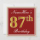 Este design de convite simples e bolsa mensageifesta de aniversario elegante apresenta uma mensagem personalizada, como "NameHere's 87th Birthday" (com o "87º" a ter uma aparência falsa/imitada de cor dourada), dentro de uma área quadrada vermelha com um contorno de fronteira simples. O nome está em um texto elegante, de cor branca, semelhante a script, e pode ser personalizado. A parte traseira apresenta detalhes personalizados do convite. Um convite de aniversário como este poderia talvez ser usado ao convidar pessoas para uma festa de aniversário em prisão preventiva para alguém que comemora seu oitenta e sétimo aniversário. [~Z0000227]