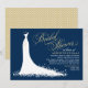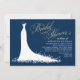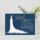 Convite de chá de panela elegante para a noiva outonal sofisticada apresenta uma fonte de caligrafia ornamentada e um vestido de noiva fluído. Detalhes de florais, borboletas e floreios acentuam o vestido etéreo. Cores branco, azul marinho (podem ser personalizadas) e dourado champanhe / bege.