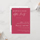 Este convite de festas de recepção do elopemento de casamento apresenta uma fonte de tipografia serif de bloqueio simples e limpa e uma caligrafia elegante em um fundo viva magenta com uma foto e um Código QR para um visual minimalista e moderno limpo, que é uma bela maneira de informar sua família e amigos que você é casado e agora é hora de festejar! A simplicidade desta design adiciona um pouco de elegância ao seu anúncio de casamento. Funciona bem com muitos temas de casamento e definitivamente um excelente extra para o seu casamento. Basta personalizar os nomes e o texto em alguns passos fáceis e personalizar o cartão de convite com sua foto do casal feliz e substituir o Código QR pelo seu no verso do convite para dar um toque pessoal agradável ao seu convite. Por favor, note: a elegante caligrafia das frases "Felizmente Nunca Depois da Festa" e "Por favor, junte-se a nós para celebrar" na frente, assim como a frase "e" e "detalhes + rsvp" no verso, juntamente com as linhas e outros trabalho de arte gráficos e elementos não podem ser editados, apagados ou movidos. Eles estão consertados. Se precisar alterar a cor, você pode personalizar o cartão de convite. Você pode personalizar e personalizar o convite para ajustado das suas necessidades de evento de casamento e clicar em personalizar o convite. Você pode personalizar facilmente o convite com o texto como um download digital e enviá-lo eletronicamente e compartilhá-lo com seus convidados através de mensagem de texto, email ou mídia social. Ou também pode optar por enviar/postar o convite relativo aos seus detalhes aos seus convidados. Ou você pode receber ambos — convite impresso e receber o convite em formato digital como um download instantâneo.