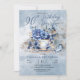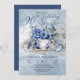 Flores azuis elegantes, clássicas e sofisticadas de inverno, com um belo pássaro azul sentado no design de chá "Par-Tea de 90 de Aniversário".