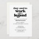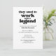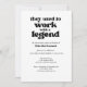 Diga adeus em estilo com este convite de aposentadoria engraçado e sincero. A frente apresenta a citação ousada "Eles costumavam trabalhar com uma lenda" junto com o nome do aposentado e os detalhes do partido — porque os colegas de trabalho também merecem algum reconhecimento. No verso, espaço para compartilhar uma memória pelas lendas convidadas. Eles podem escrever uma memória e levá-la para a festa. Fazer que seja uma manutenção personalizada que eles realmente apreciarão. É uma despedida perfeita do aposentado para aqueles que tornaram os dias de trabalho mais agradáveis (ou pelo menos mais suportáveis). Obrigados por seu interesse — não se esqueça de dar a ele como se isso te fizesse sorrir! Poupe papel, tempo e dinheiro! Solicitar um download digital