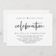O moderno Black Script temático, cartão de convite para elopementos de casamento (Felizmente, para sempre após a celebração). É perfeito para sua recepção de elopemento de casamento/festa de celebração de posto. Adicione seus detalhes em caracteres pretos / letras correspondentes.