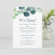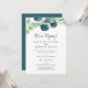 Este cartão de recepção de elopemento de eucalipto e verde é perfeito para um elegante partido de elopemento poste de quintal. O design botânico moderno apresenta um belo eucalipto azul-aquarela e folhas verdes. As placas RSVP são vendidas separadamente.