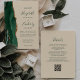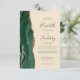 This elegant modern wedding invitation features an emerald green watercolor agate border trimmed with faux gold glitter. The customizable text combines green handwriting, copperplate and italic fonts on a champagne beige background. Add additional details on the back, along with a QR code to help your guests visit your wedding website.