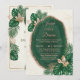 This design features a striking emerald green agate geode slice edged in gold, framed by lush tropical Monstera and palm leaves, and accented with sparkling clear quartz crystals. Set against a textured cream backdrop, this design is the perfect mix of organic luxury and modern style. It is ideal for a jungle, tropical, or bohemian-themed celebration.