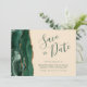 Este elegante e moderno salve o cartão de data apresenta um emerald verde aquarela agate border aparado com falso brilho dourado. O texto personalizável combina o script de escrita manual, as fontes em copperplate e itálico em verde esmeralda em um fundo bege de champanhe. O verso apresenta um design emerald verde e dourado.