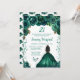 Este elegante e glamouroso convite de aniversário apresenta uma bela princesa com cabelo castanho e pele escura num vestido esmeraldo de bola verde. O texto combina o script manuscrito e as fontes sans serif modernas para um aspecto elegante e sofisticado. Os arranjos florais, borboleta e confete criam a mistura perfeita de rústico e chic. Gráficos por www.etsy.com/uk/shop/SunflowerDayLove