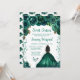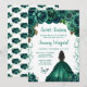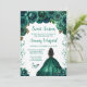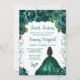 Este elegante e glamouroso e doce convite de 16 anos apresenta uma bela princesa com cabelo castanho e pele escura em um vestido esmeralda de bola verde. O texto combina o script manuscrito e as fontes sans serif modernas para um aspecto elegante e sofisticado. Os arranjos florais, borboleta e confete criam a mistura perfeita de rústico e chic. Gráficos por www.etsy.com/uk/shop/SunflowerDayLove