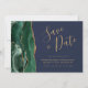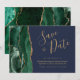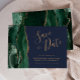 Este elegante e moderno salve o cartão de data apresenta um emerald verde aquarela agate border aparado com falso brilho dourado. O texto personalizável combina um script de escrita manuscrita dourado, fontes copperplate e itálico em um fundo azul marinho. O verso apresenta um design emerald verde e dourado.