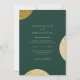 Clássica Minimalista Emerald Green e Dourados Convites de Casamento. Apresentando uma tipografia elegante mostrando seus nomes e detalhes de casamento em matiz dourada contra um fundo verde esmeralda com círculos brilhantes dourados e colocados delicadamente nas bordas da design.