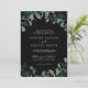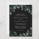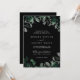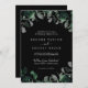 Este convite de casamento preto esmeralda é perfeito para um casamento de boho. A elegante, porém rústica, design apresenta folhas de cor verde-d-água escura e umeucalipto com uma moderna sensação de floresta boêmica.
