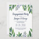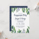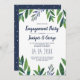 Convite de festa de noivado verde com ramificações desenhadas à mão cheias de textura aquosa em torno do seu convite em azul escuro.