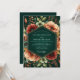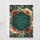 Embrace a dramatic and romantic atmosphere with this moody botanical design. A deep emerald background provides a stunning contrast for a lavish arrangement of autumn-toned blossoms. Lush, painterly peonies and smaller blooms in shades of terracotta, rust, and crimson are artfully woven with delicate berries and greenery for a sophisticated affair.