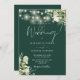 Este elegante convite de casamento verde esmeralda apresenta bonito luzes de cordas e verde floral e pode ser personalizado com suas informações em tipografia quic com suas iniciais de monograma no verso. Projetado por Thisnotme©