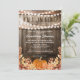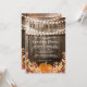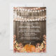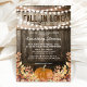 Convites rústicos de chá de panela de outono com fundo de barril de madeira de carvalho de celeiro country, luzes cintilantes, folhas de outono, abóbora da colheita e um modelo de amor de outono que é fácil de personalizar.