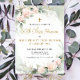 Este convite de reunião de turma lindo apresenta flores de aquarela rosa e cinza com uma cruz dourada. É perfeito para uma reunião de escola religiosa.
