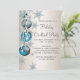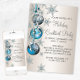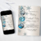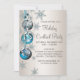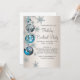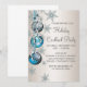 Convites de festa de Natal e festa de fim de ano com flocos de neve e enfeites azuis turquesa e prata. Adicione seus detalhes na frente e/ou verso simplesmente adicionando os detalhes do evento, estilo de fonte, tamanho e cor da fonte e texto. Por favor, note que todos os desenhos de convite que você encontrará no Zazzle são gráficos impressos sem joias, laços, relevos, rebaixados ou peças ou partes adicionadas.