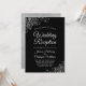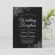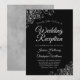 Os convites de casamento são projetados para convidados que são convidados apenas para a recepção, mas não para a cerimônia propriamente dita. Eles apresentam um design simples, mas elegante, com enfeites prateados ornamentados em folha falsa em um fundo preto clássico com letras em escrita elegante e um verso marmorizado prateado-cinza.