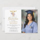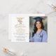 Um delicado arranjo botânico de cor d'água de rosas roxos e verde com borrifadores de ouro macio (isto é um efeito digital, não uma folha de ouro real), assim como um caduceus dourado são as elegantes decorações para este simples, clássico, moderno convite para a graduação em enfermagem com fotografia, que você pode personalizar e modificar completamente com o nome da escola, a graduação etc. A grande área de modelo permite muito espaço para incluir a localização da cerimônia de graduação e uma celebração depois, ou personalizá-la simplesmente com os detalhes da festa de formatura.