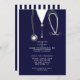 A formação escolar de enfermagem criativa convida a apresentar esfregões de hospital azul marinho e um estetoscópio. Editar texto para criar convites de festas de enfermagem ou anúncios de formando exclusivos.