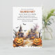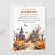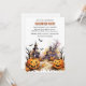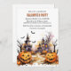 O convite para a festa do Dia das Bruxas, com uma mansão assombrada, picos e fantasmas engraçados.