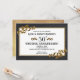 Convite Enquadrado Dourado para Bodas de Ouro 50 Anos de Casamento projetado com uma moldura preta, inserção dourada e detalhes em fita. O verso tem um fundo texturizado dourado. Para personalizar, basta inserir seus detalhes no nosso modelo fácil, substituindo o texto de exemplo. Certifique-se de ver o Banner de Festa correspondente.