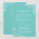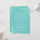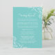 Adicione um toque fresco e arejado à noite do seu ensaio com este convite de jantar de ensaio de casamento aqua. Os floreios de pergaminho branco adornam os cantos, enquanto a caligrafia graciosa destaca um doce poema rimado que compartilha todos os detalhes necessários para os convidados. O fundo aqua suave evoca um charme leve e inspirado na costa. Personalize todos os elementos, incluindo texto, cores e fontes para combinar com o seu evento.