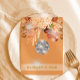 Marque a cena de uma comemoração temática do Disco. Laranja é a cor de fundo para este design de Janto personalizado elegante da bola Disco floral. As manchas de prata também estão no design. Altere facilmente as informações para o seu próprio convite personalizado. Elegante design de casamento formal.
