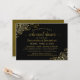 Este belo convite para jantas de ensaio é simples e elegante. Apresenta texto dourado sobre fundo preto, com folhas de papel sujo ou filigrana nos cantos. Ele tem informações sobre o ensaio de casamento, assim como sobre o janto comemorativo que se segue. Perfeito por manter a noiva informada sobre todas as festividades pré-casamento.