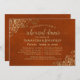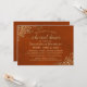 Este belo convite para jantas de ensaio é simples e elegante. Apresenta texto dourado sobre um fundo laranja de ferrugem esmagado com folhas de papel sujas ou filigranas de ouro ladas nos cantos. Ele tem informações sobre o ensaio de casamento, assim como sobre o janto comemorativo que se segue. Perfeito por manter a noiva informada sobre todas as festividades pré-casamento.
