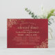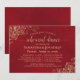 Este belo convite para jantas de ensaio é simples e elegante. Apresenta texto dourado sobre um fundo vermelho esmagado, gravmson, com folhas de alumínio falsas ou filigrana nos cantos. Ele tem informações sobre o ensaio de casamento, assim como sobre o janto comemorativo que se segue. Perfeito por manter a noiva informada sobre todas as festividades pré-casamento.