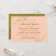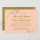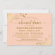 Este belo convite para jantas de ensaio é simples e elegante. Apresenta texto dourado sobre fundo cor de laranja claro ou cor de pêssego coral, com folhas de papel sujas de ouro ou filigranas nos cantos. Ele tem informações sobre o ensaio de casamento, assim como sobre o janto comemorativo que se segue. Perfeito por manter a noiva informada sobre todas as festividades pré-casamento.
