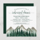 Este belo convite de janto de ensaio de casamento apresenta um design rústico com uma paisagem aquática de picos de montanha com pinheiros em primeiro plano. O título elegante da caligrafia verde da floresta dá classe e estilo. Inclui informações sobre o ensaio e o janto. Maneira perfeita de manter a festa de casamento informada enquanto os agradece por fazerem parte do seu dia especial.