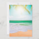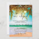 Praia com palmeiras, sol, luzes de corda e roteiro.