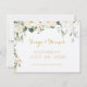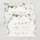 Cartão de save the date de casamento rústico com peônias brancas e folhagens prateadas.