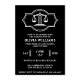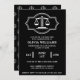 Um convite elegante para a festa de formatura da Faculdade de Direito. Apresentando as escalas icônicas da justiça, um símbolo eterno da lei. Um design sofisticado e na moda numa paleta de cores preto e branco. Perfeito para qualquer formando de lei. Os modelos de texto são fáceis de personalizar. Disponível como placas impressas ou como um download instantâneo para enviar em seu telefone.