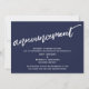 A distinção deste conjunto deve-se à fonte moderna, escrita à mão, utilizada para frases de sotaque. Se precisar avisar seus hóspedes que seu casamento foi cancelado, este cartão oferece uma opção ousada e atraente. Nesta peça, a letra do script com letra manuscrita foi usada para criar um gráfico simples que retrata a palavra "anúncio". Use os campos modelo para adicionar seus detalhes pessoais e tornar este design único e moderno seu próprio. O fundo sólido pode ser alterado para qualquer cor que você preferir. Por favor, responda a quaisquer solicitações especiais ou personalize a assistência. 100 //