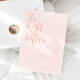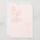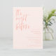 Um convite minimalista de janto de ensaio de casamento com uma letra moderna que diz "na noite anterior". O plano de fundo é cor-de-rosa-claro.