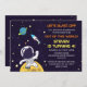Convite de aniversário com um fundo azul escuro com estrelas amarelas espalhadas ao redor. Camadas sobre o topo é uma ilustração de um homem espacial vestindo um traje astronauta branco flutuando sobre a lua. À distância está um planeta com anéis e um foguete voando para o céu procurando novos mundos para explorar