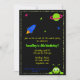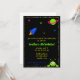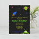 Uma cena espacial completa com um foguete e alienígena neste convite divertido.